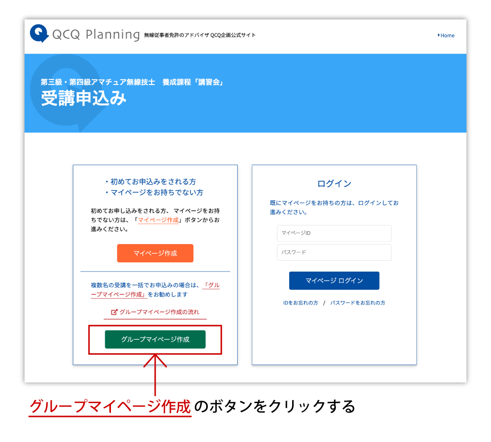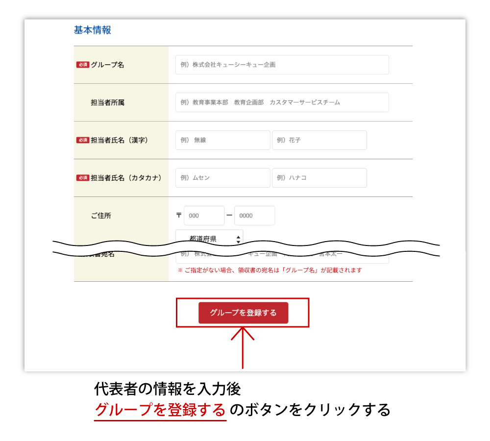 代表者情報を入力し、「グループを登録する」を押すとグループマイページが作成され、受講者一覧ページに移動します 注:グループマイページ代表者含め、グループマイページに登録する受講者のメールアドレス重複は不可です。ご注意ください