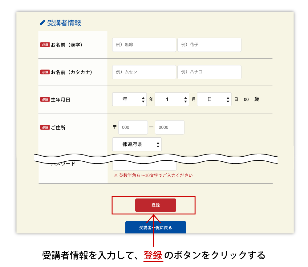複数の受講者を登録できます グループ代表者も受講する場合は、「受講者」として新規追加します 注:グループマイページ代表者含め、グループマイページに登録する受講者のメールアドレス重複は不可です。ご注意ください