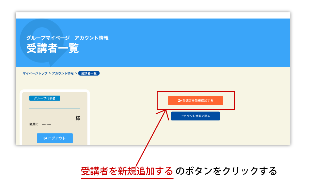 グループマイページの受講者一覧ページで「受講者を新規追加する」から受講者を登録します