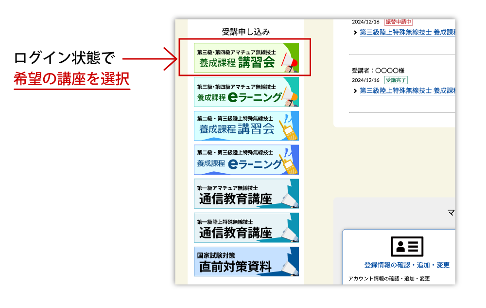 希望講座の「申込む」ボタンをクリックすると、ログイン状態の画面が表示されます