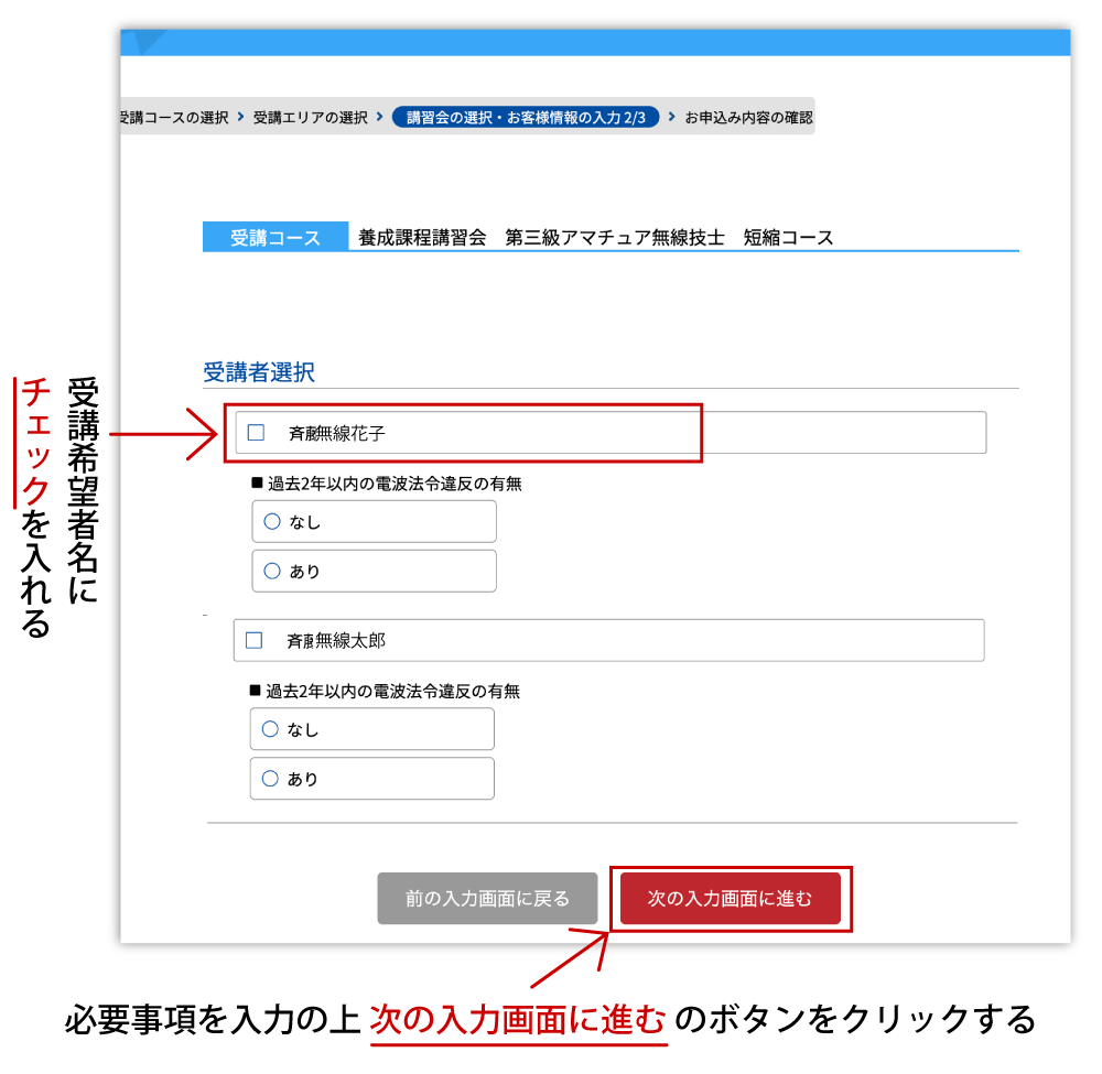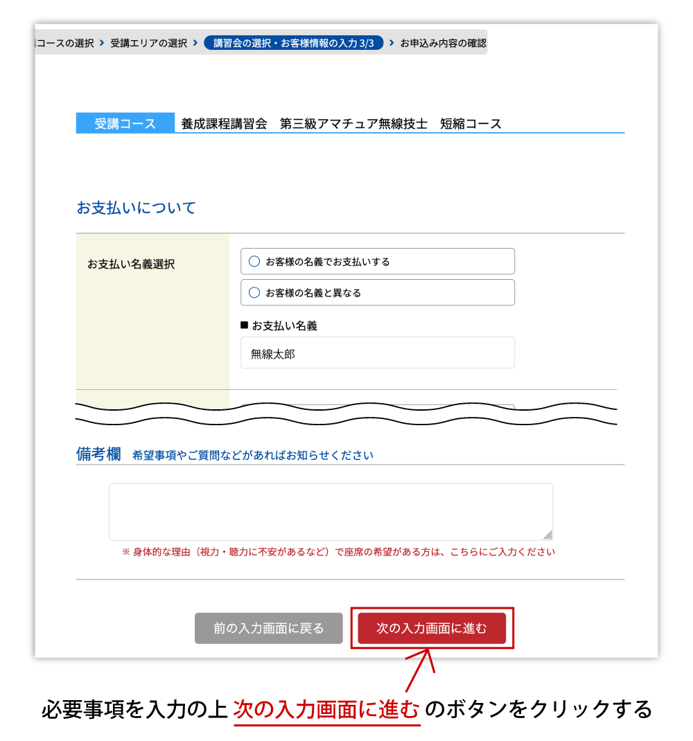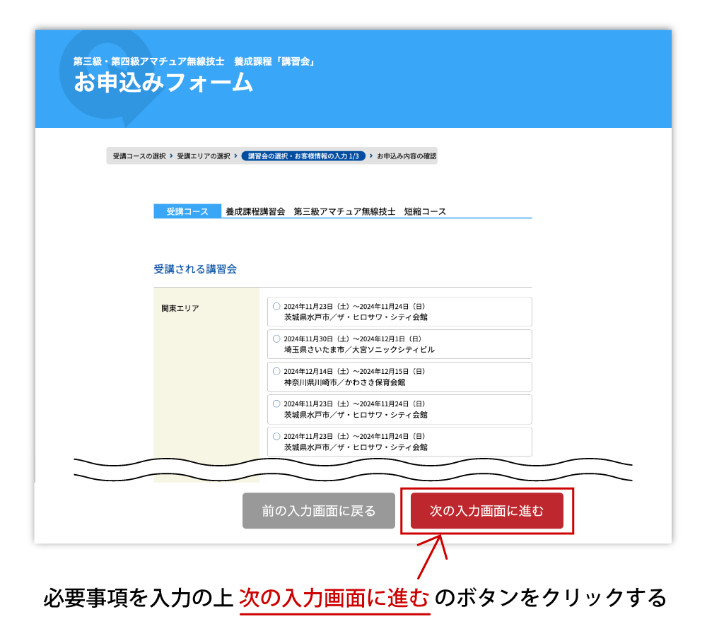 ご希望のコースが選択されているか確認の上、「次の入力画面に進む」ボタンをクリックして、次の画面へお進みください