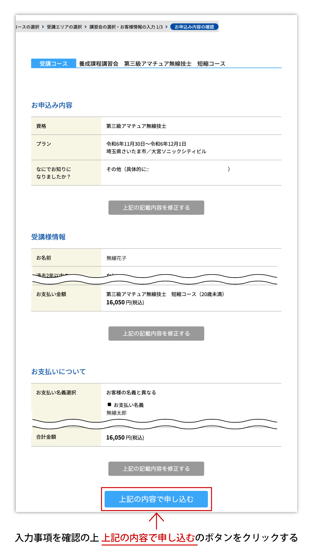 「お申込み内容」「受講者様情報」「お支払いについて」の入力内容をご確認の上、お申し込みください